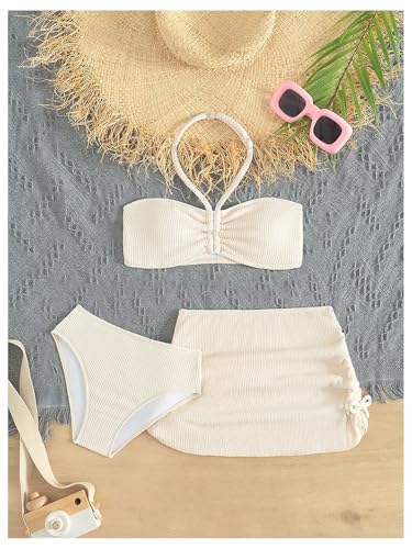 HOT ! Girl's Swimsuits 3 Piece Textured Ruched Halter Bathing Suits with Drawstring Side Beach Skirts
