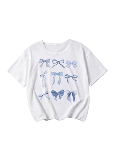 OYOANGLE Girl's Bow Graphic Print Tee Shirt Crew Neck Short Sleeve Cute Casual Tee Tops 1