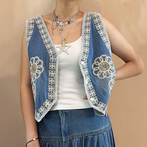 HOT ! Mxiqqpltky Embroidered Denim Vest Tops Women Y2k Sleevelss Button Down Open Front Floral Boho Tank Top Cropped Waistcoat
